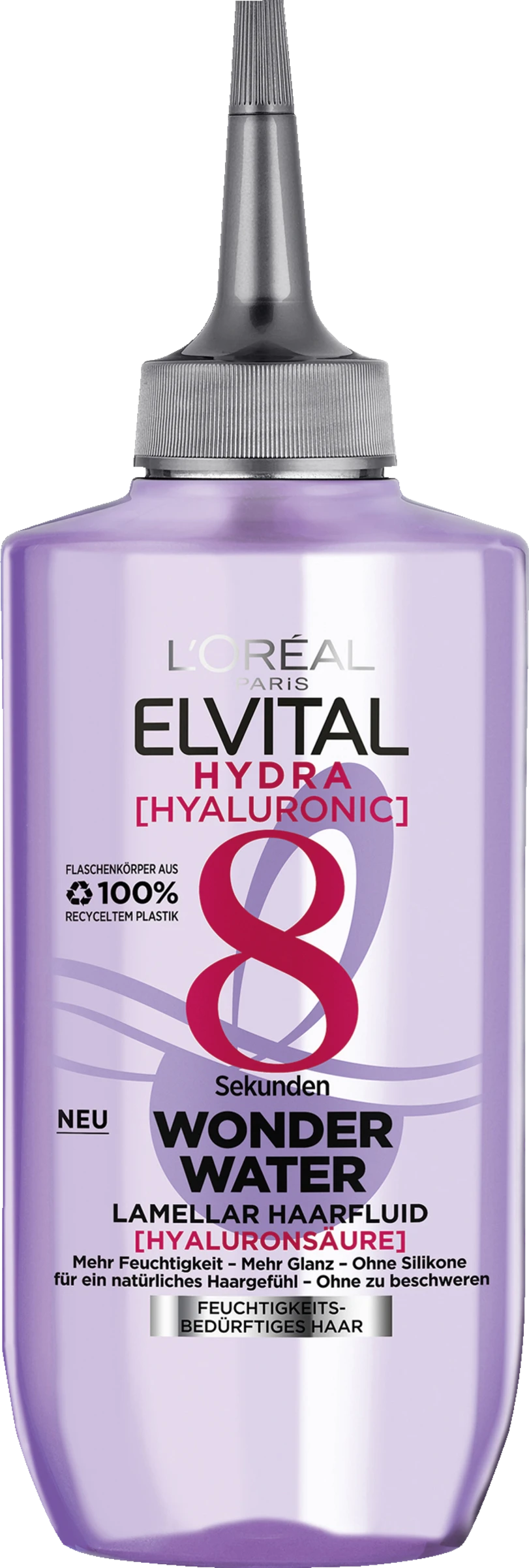 Ihre Traum-Haar Transformation in nur 8 Sekunden: Mit dem Elvital Hydra [Hyaluronic] Wonder Water Haarfluid von L’Oréal Paris können Sie Ihrem trockenen Haar etwas Gutes tun. Das feuchtigkeitsspendende Fluid wirkt in Sekundenschnelle ins ausgelaugte Haar ein und gleicht Schäden aus, die etwa durch Hitze oder unzureichende Pflege entstehen können. Das Ergebnis: gesund aussehendes, hydratisiertes Haar. Gleichzeitig verleiht das feuchtigkeitsspendende Haarfluid einen intensiven Glanz – ganz ohne Silikone. Durch die schwerelose Haarpflege wird zudem die Kämmbarkeit verbessert und das Styling vereinfacht.