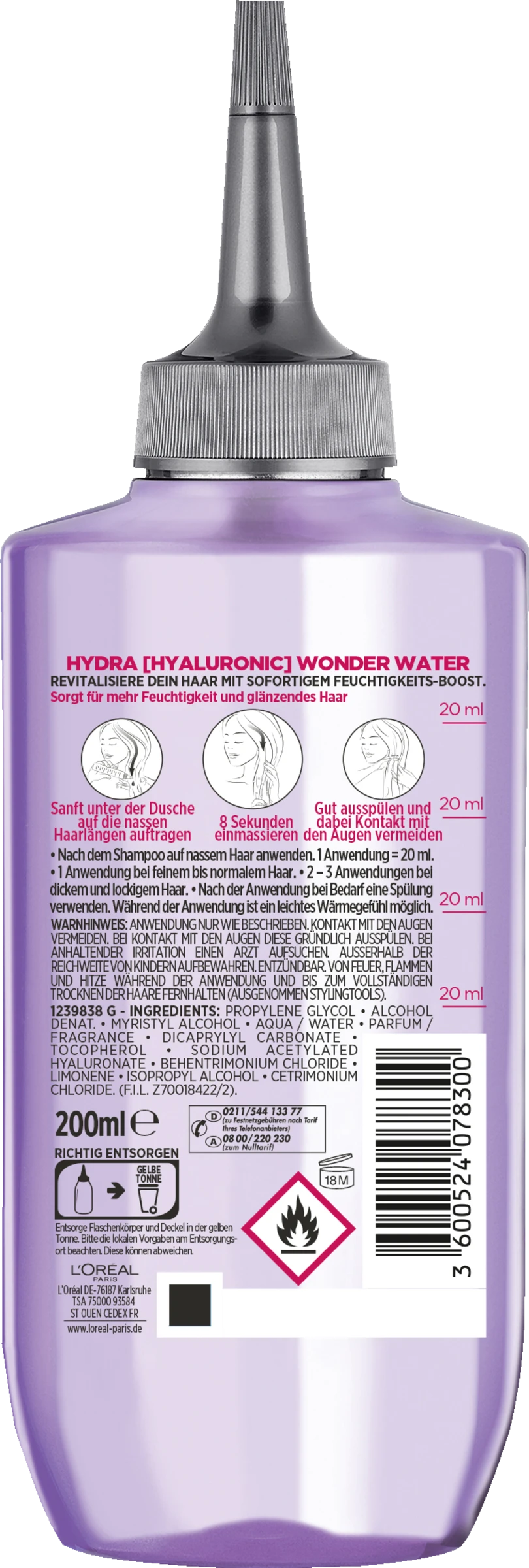 Tragen Sie nach dem Haarewaschen etwa 20 ml des Haarfluids von L’Oréal Paris auf die nassen Haarlängen auf. Anschließend für 8 Sekunden sanft einmassieren. Gut ausspülen und dabei Kontakt mit den Augen vermeiden.