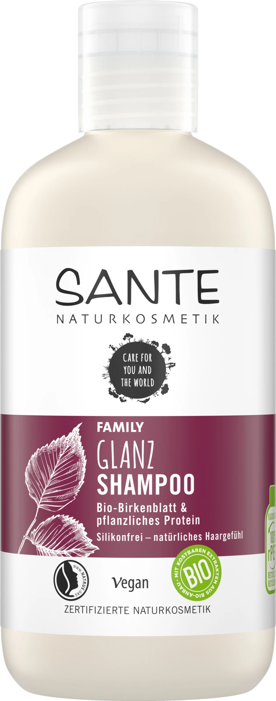 Das SANTE FAMILY Glanz Shampoo mit Bio-Birkenblatt für normales und glanzloses Haar spendet neue Geschmeidigkeit und Glanz. Die natürlich wirksame Pflegeformel reinigt besonders mild und schäumt zart. Mit rein natürlichem, zarten Kokosduft. Verträglichkeit dermatologisch getestet.
