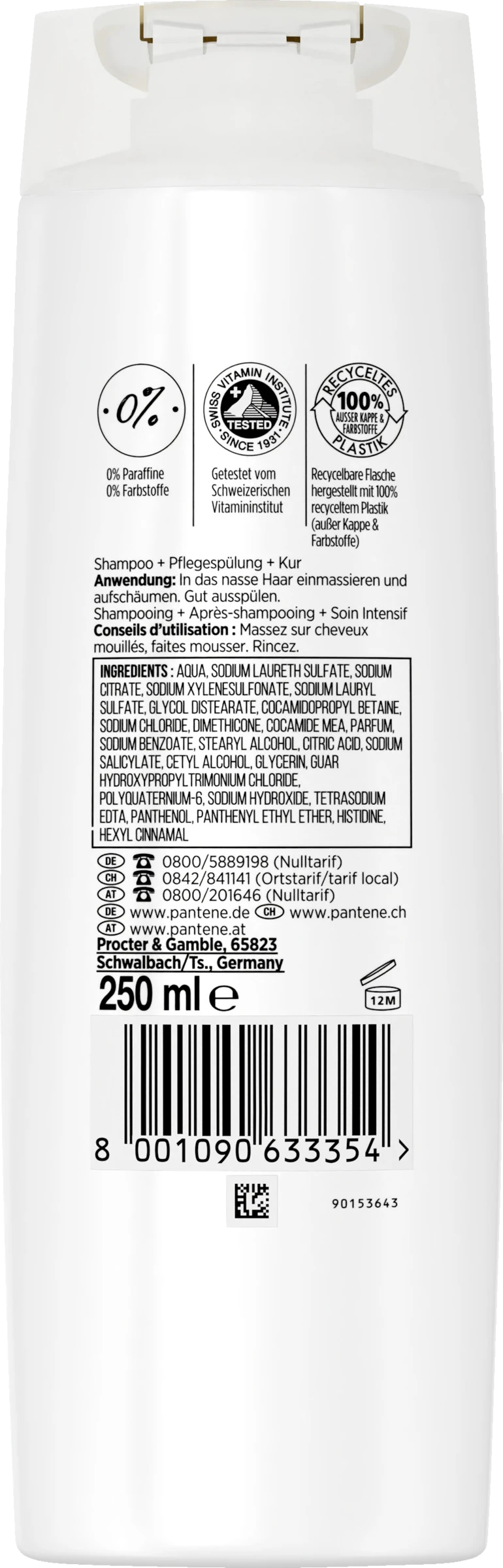 Aqua, Sodium Laureth Sulfate, Sodium Citrate, Sodium Xylenesulfonate, Sodium Lauryl Sulfate, Glycol Distearate, Cocamidopropyl Betaine, Sodium Chloride, Dimethicone, Cocamide MEA, Parfum, Stearyl Alcohol, Citric Acid, Sodium Benzoate, Cetyl Alcohol, Glycerin, Tetrasodium EDTA, Guar Hydroxypropyltrimonium Chloride, Polyquaternium-6, Sodium Hydroxide, Panthenol, Panthenyl Ethyl Ether, Histidine, Hexyl Cinnamal, Magnesium Nitrate, Methylchloroisothiazolinone, Magnesium Chloride, Methylisothiazolinone